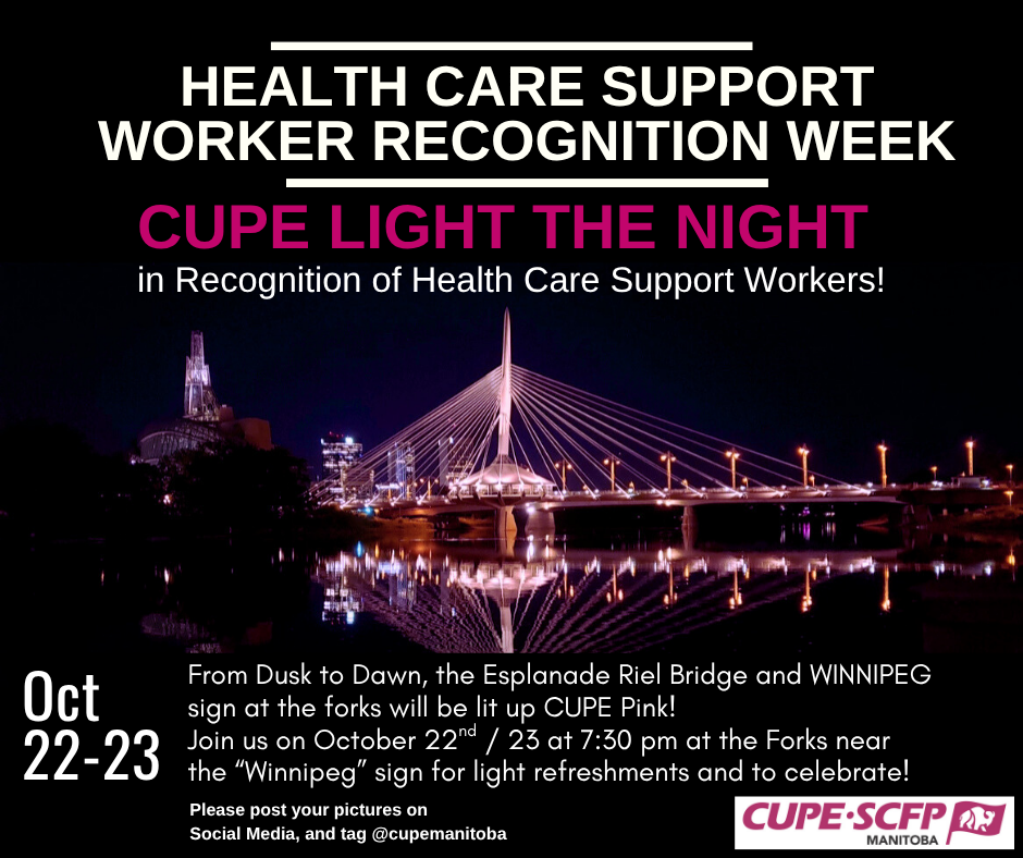 CUPE Manitoba will light the Winnipeg sign and the Esplanade Riel Bridge in CUPE Pink in recognition of all the Health Care Support Workers in Manitoba. See attached poster here