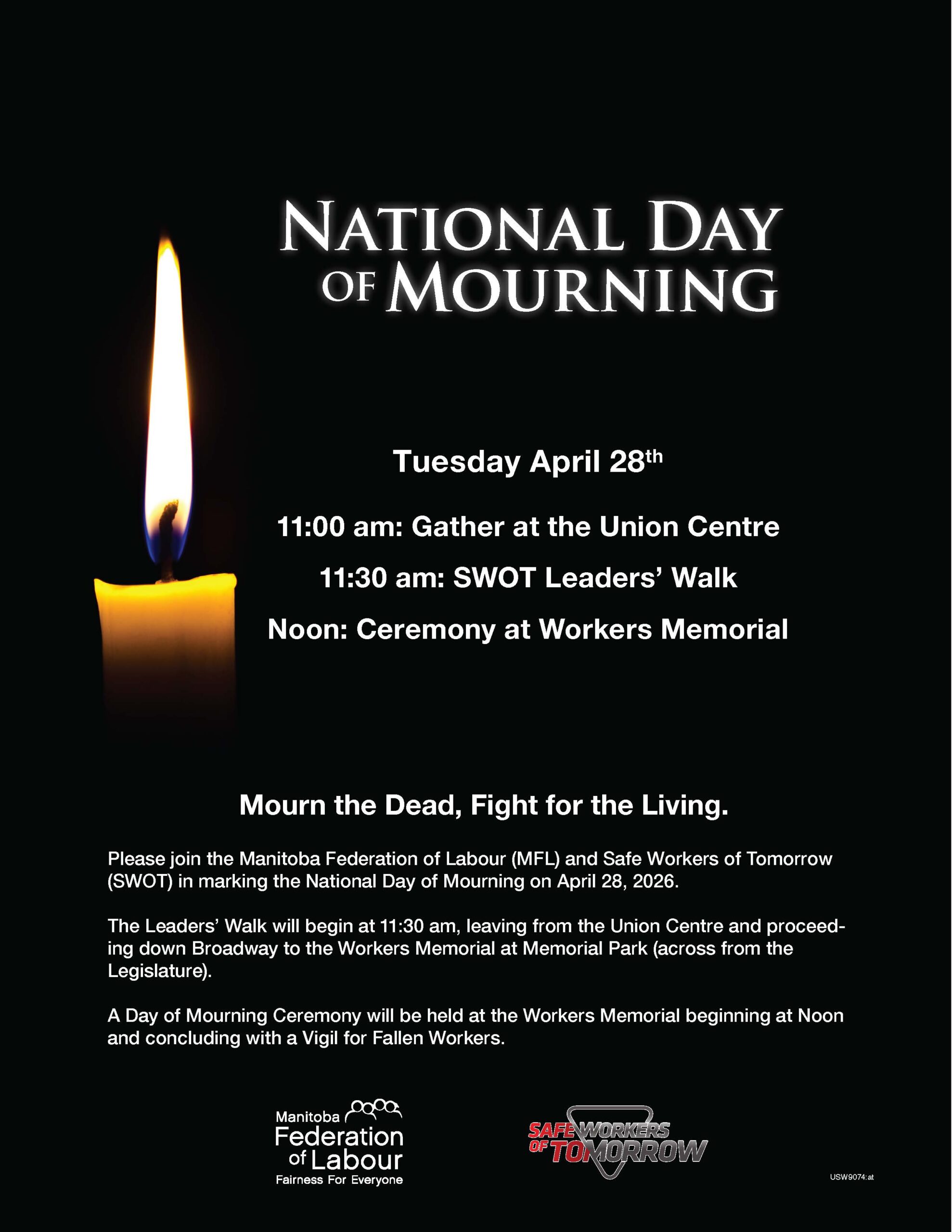 Please join CUPE Local 998 as well as other unions from across Manitoba for the Manitoba Federation of Labour and Safe Workers of Tomorrow in marking the National Day of Mourning on April 28, 2026.